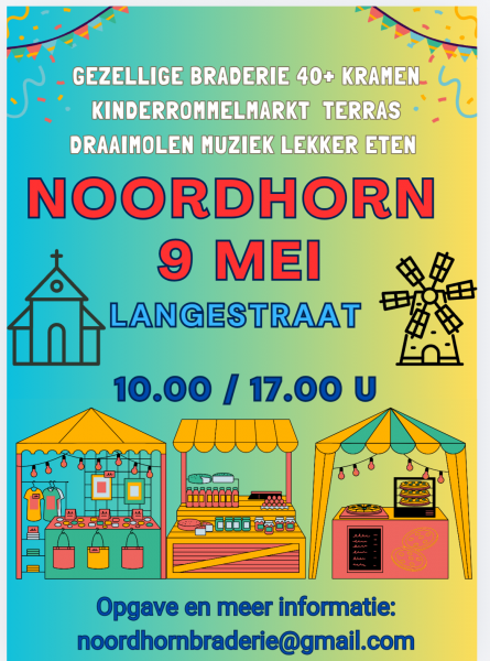 Gezellig braderie in Noordhorn 9 mei Van 10 tot 17 u. Met ruim 40 standhouders is er voor ieder wat wils.