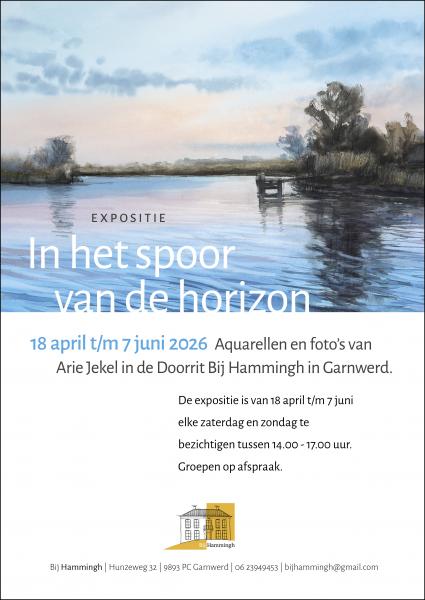 Aquarellen en foto’s van Arie Jekel te zien in de Doorrit Bij Hammingh in Garnwerd. De expositie is van 18 april t/m 7 juni elke zaterdag en zondag te bezichtigen tussen 14.00 - 17.00 uur. Groepen op afspraak.