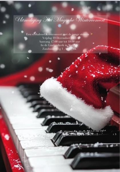 De winter staat voor de deur en dat betekent dat het weer tijd is voor een Magisch Winterconcert! Graag nodigt pianodocente Petra Wielemaker iedereen van harte uit om te komen genieten van een gezellige middag vol pianomuziek, sfeer en winterse gezelligheid.