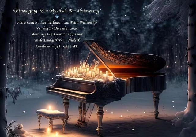 De winter staat voor de deur en dat betekent dat het weer tijd is voor een Muzikale Kerstbetovering! Graag nodigt pianodocente Petra Wielemaker iedereen van harte uit om te komen genieten van een gezellige avond vol pianomuziek, sfeer en winterse gezelligheid.