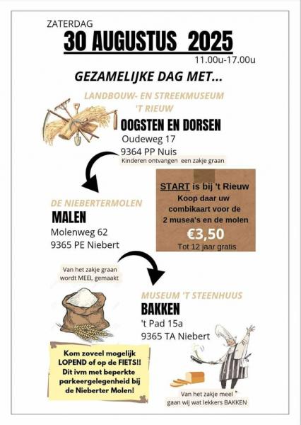 Een gezamenlijke dag met Landbouw Museum 't Rieuw in Nuis, de Nieberter Molen en Museum 't Steenhuus in Niebert. De start is bij 't Rieuw waar het graan wordt geoogst en gedorst. De kinderen krijgen een zakje graan mee en van daaruit gaan ze naar de Molen en wordt er van het graan meel gemaakt. Met een zakje meel gaan ze naar het Museum 't Steenhuus waar er wat lekkers van wordt gebakken. kortom, een leuke leerzame dag voor jong en oud!!