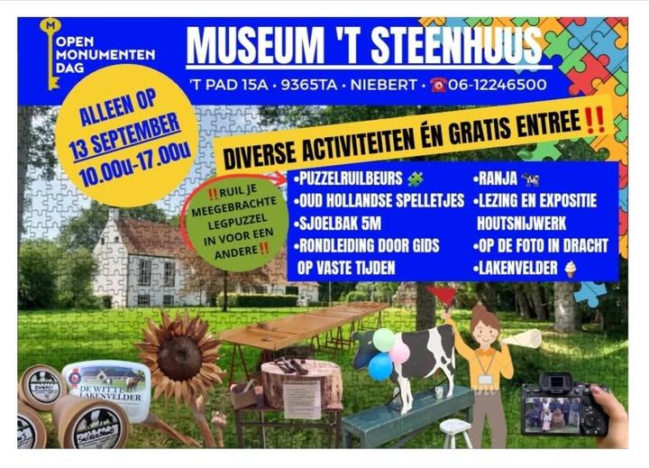 Diverse activiteiten oa: puzzelruilbeurs(een puzzel meenemen dus), op de foto in dracht, Lakenvelder ijs van de Roordahoeve, speurtocht voor de jeugd, lezing over houtsnijwerk én de wisselexpositie "Jaargetijden in Hout" is te bezichtigen, oud Hollandse spelletjes, elk uur een rondleiding door gidsen. Genoeg te zien en te beleven dus, de entree is GRATIS op zaterdag 13 september!