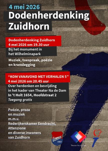 Op de avond van de Nationale Dodenherdenking op 4 mei zetten theatermakers en artiesten in heel Nederland zich in om deze dag van extra betekenis te voorzien. Elk jaar spelen gelijktijdig meer dan honderd voorstellingen, die ieder op hun eigen manier betrekking hebben op de Tweede Wereldoorlog. In Zuidhorn is op deze avond een lokale versie van Theater Na de Dam te zien in de bovenzaal van In ’t Holt 1654.