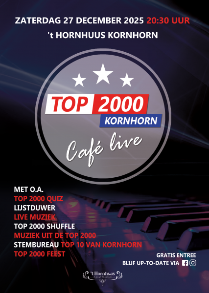 ’t Hornhuus zal op zaterdag 27 december weer dienstdoen als Top 2000 café. Evenals voorgaande jaren wordt er weer een muzikaal, avondvullend programma verzorgd door de mannen van Top 2000 Café Live.