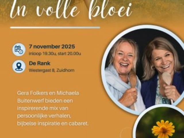 Gera Folkerts en Michaela Buitenwerf zijn uitgenodigd te komen spreken over het thema 'In volle bloei'. Er is een aantal leuke kraampjes en houd je van zingen, kom dan om 19.00 uur naar de zangworkshop. Er wordt een lied ingestudeerd die aan het begin van de avond gezongen wordt. Wil je daaraan meedoen, geef dat dan aan bij de opgave.