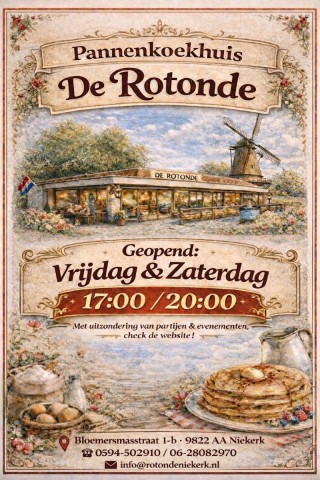 Het veelzijdige horecabedrijf is gelegen in het hart van Niekerk en biedt een scala aan mogelijkheden. Zo is er elke laatste vrijdag van de maand „Eten wat de pot Schaft“. Je kunt dan genieten van een heerlijk lopend buffet voor maar € 17,50 ( excl drankjes ) » Reserveren verplicht vol = vol